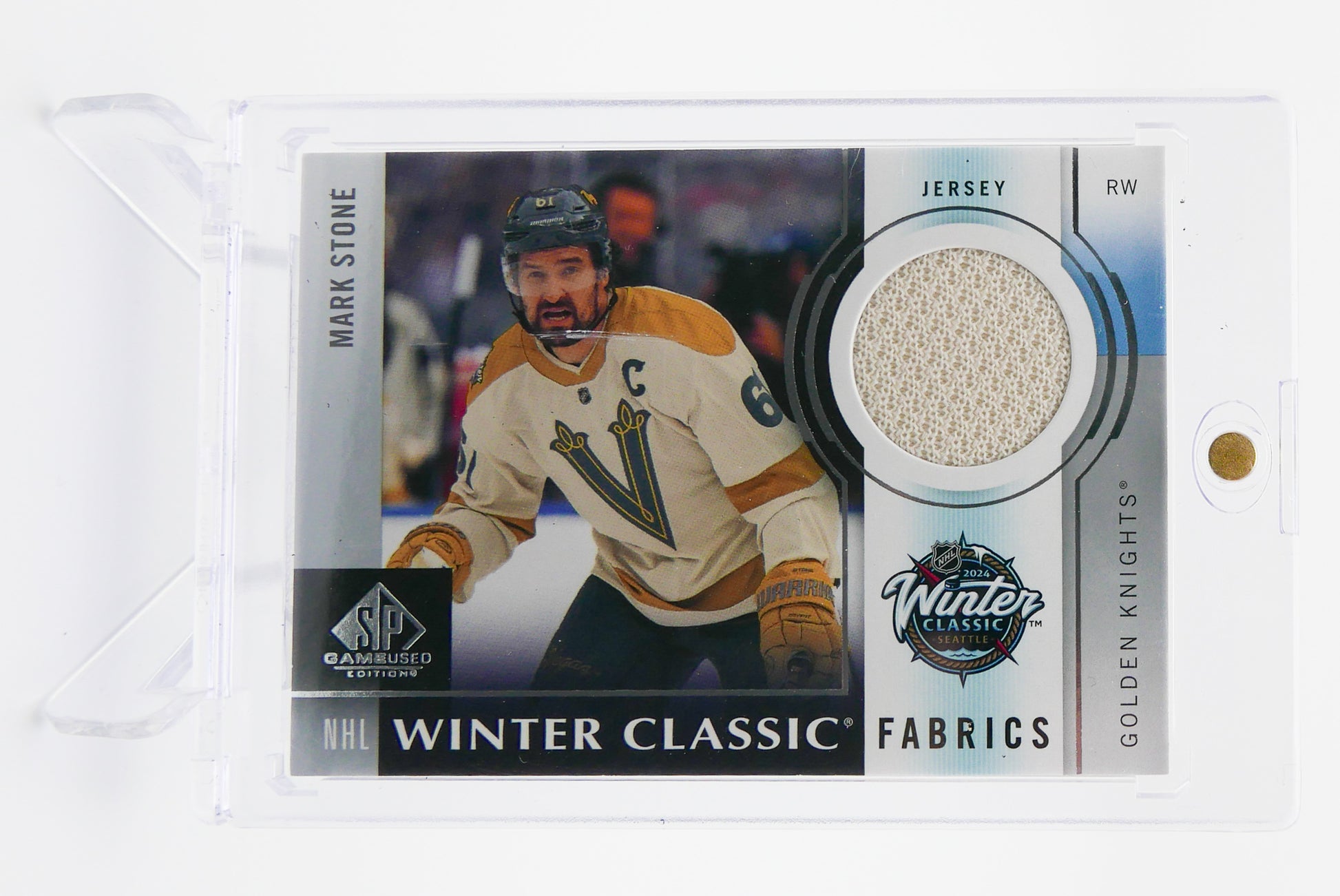 This Winter Classic Fabrics memorabilia card from 2024-25 Upper Deck SP Game Used Hockey features an event-worn jersey swatch from Mark Stone of the Vegas Golden Knights.