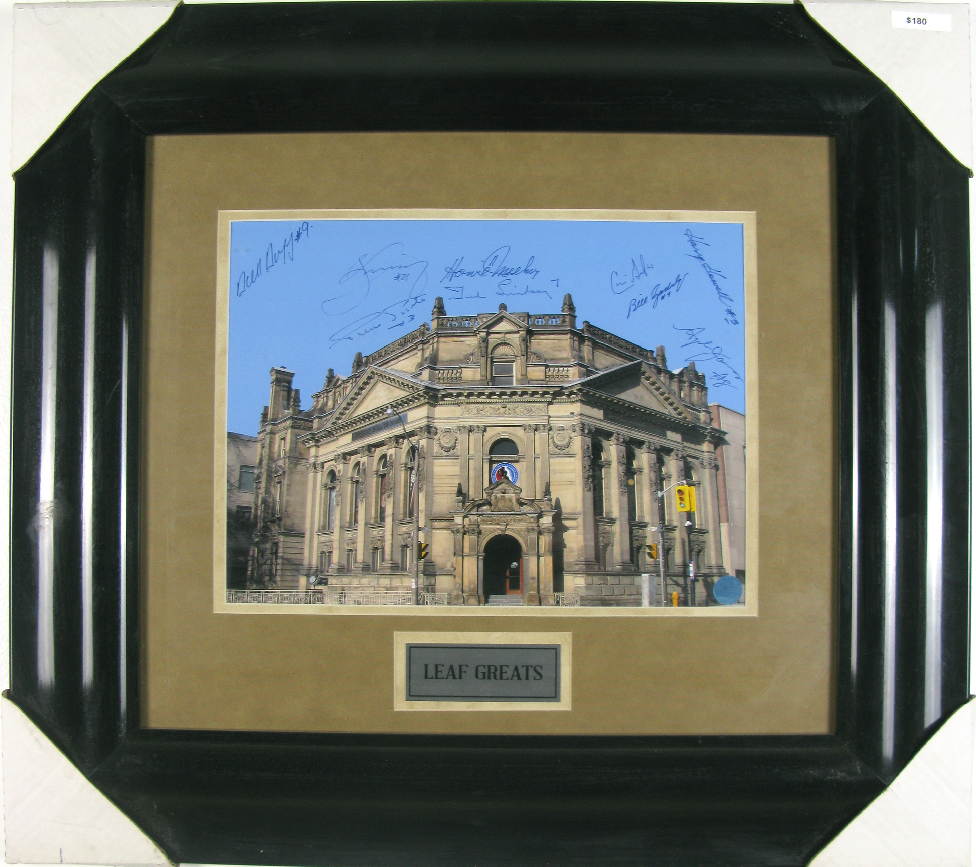 A rare and highly collectible multi-signed “Leaf Greats” framed display, featuring autographs from several Toronto Maple Leafs legends. This limited-run series is numbered 265 of 507, making it an excellent centerpiece for any Leafs or NHL memorabilia collection.